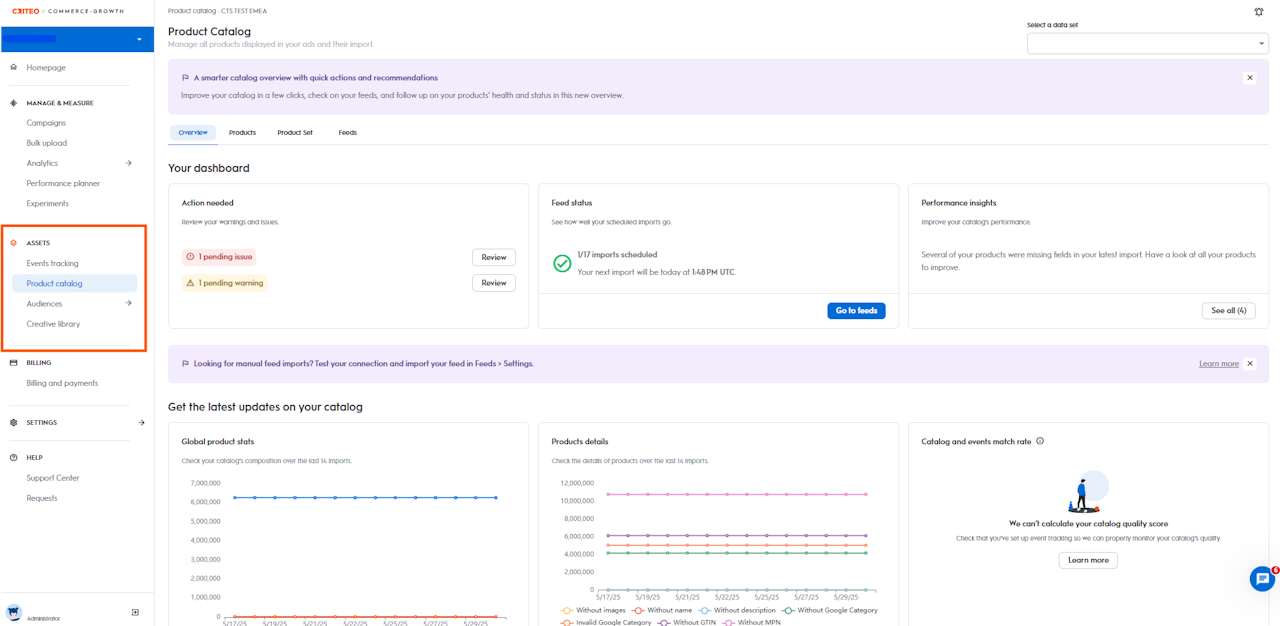 Using the left navigation bar in Commerce Growth, go to the Assets section > Product Catalog.