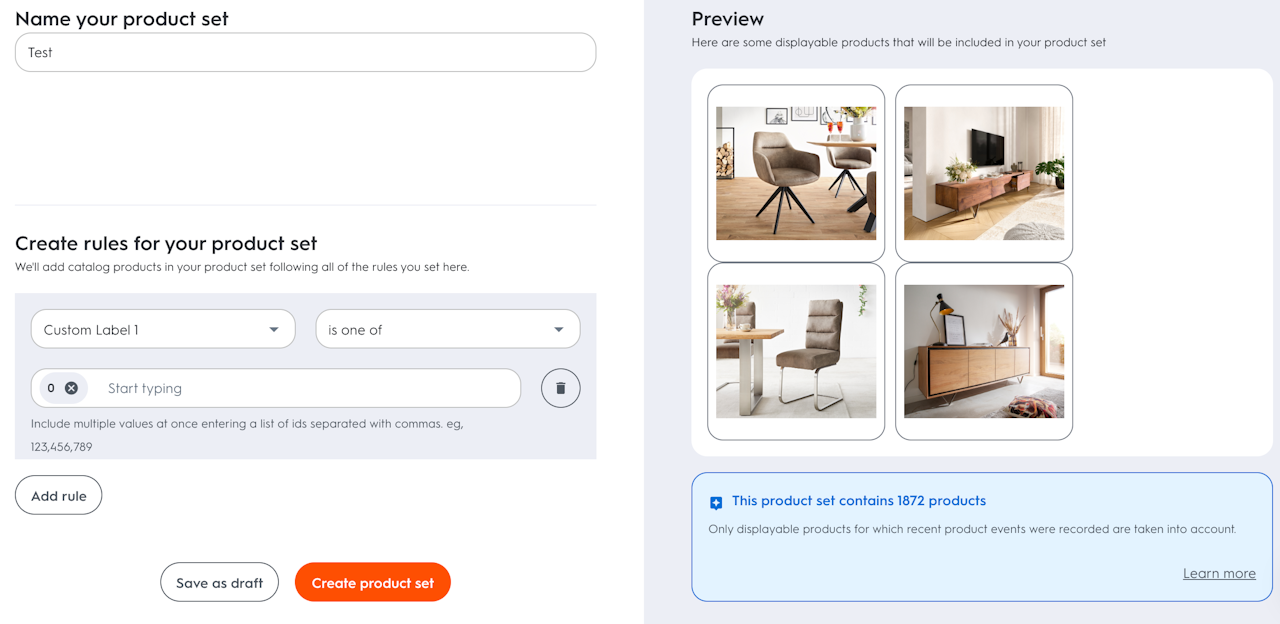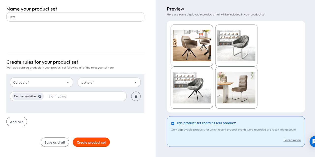 Once created a product set can be applied to an ad as a product recommendation filter. As a result, only products that belong to that product set are displayed in the ad.
