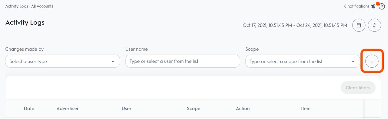 Use Activity Logs to review all events and actions on your Criteo campaigns. You can access Activity Logs from the Settings section in the Navigation Bar in Criteo Management Center.