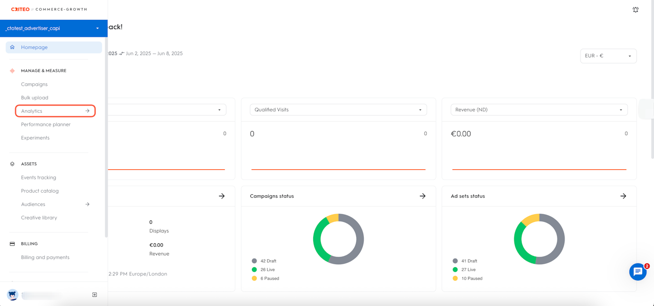 Using the left navigation bar in Commerce Growth, navigate to Analytics under the Manage and Measure section.
