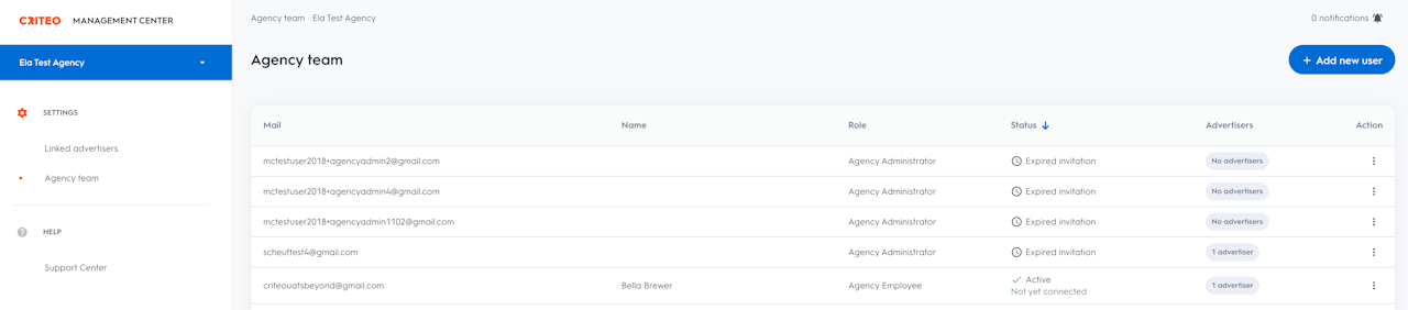 The "Agency team" page clarifies the users, their roles within the agency, and which advertisers are assigned to each user.