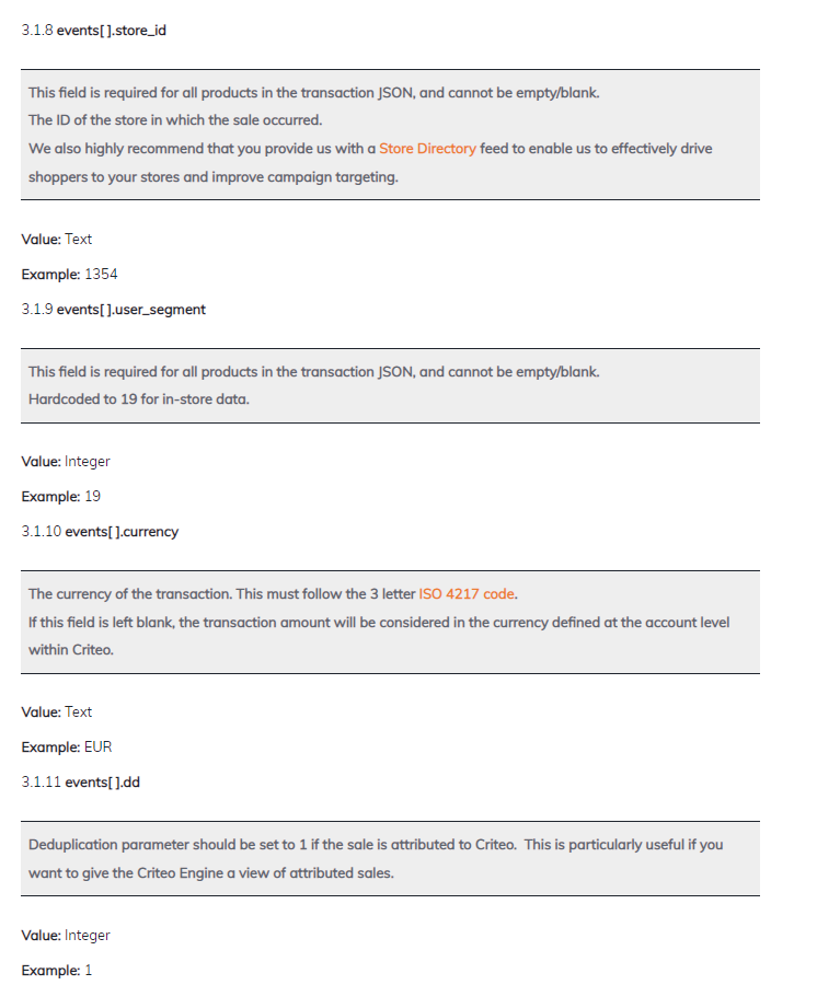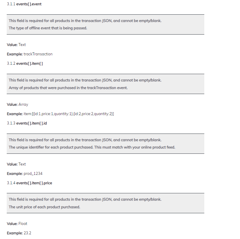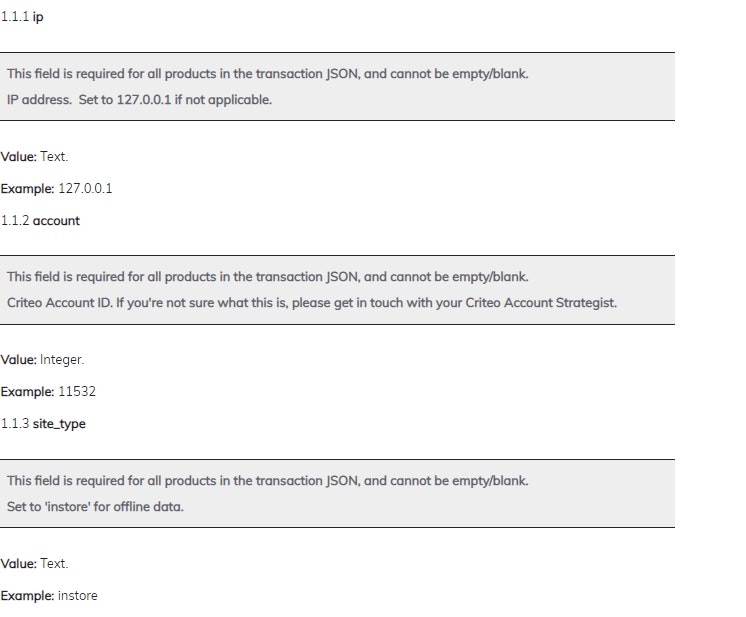 Please see below the set of transaction data parameters that must be provided in the JSON Request body in order to pass your offline sales data to the Criteo Offline API.