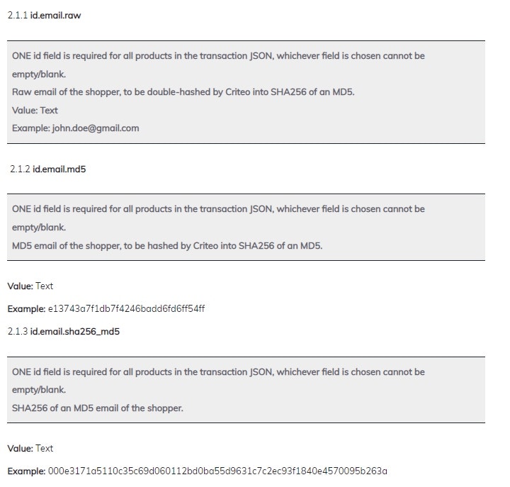 Emails will be ingested into Criteo’s identity graph as SHA256 of an MD5. If you are unable to provide emails in this format you can provide either raw or MD5 encrypted emails, which will be hashed on the fly by Criteo before being ingested.