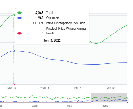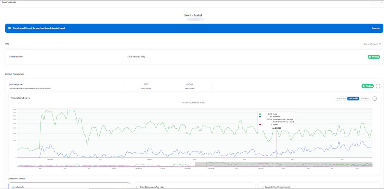 Note: The error codes are a good hint on what might be wrong with the configuration although we have the same limitation as with event alerts, which is the computation taking into account the overall event count while the UI is splitting them by environment. In the chart above, you can see the total events count along with the error codes attributed to the parameter.