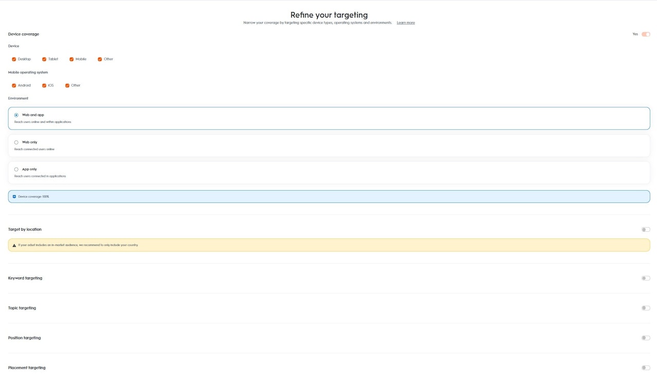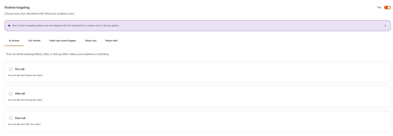 動画の配信面が新たな IAB 分類に移行されることで、希望する配信面タイプ(アウトストリームまたはインストリーム)を選択できるようになり、よりターゲットを絞った広告を配信できるようになります。