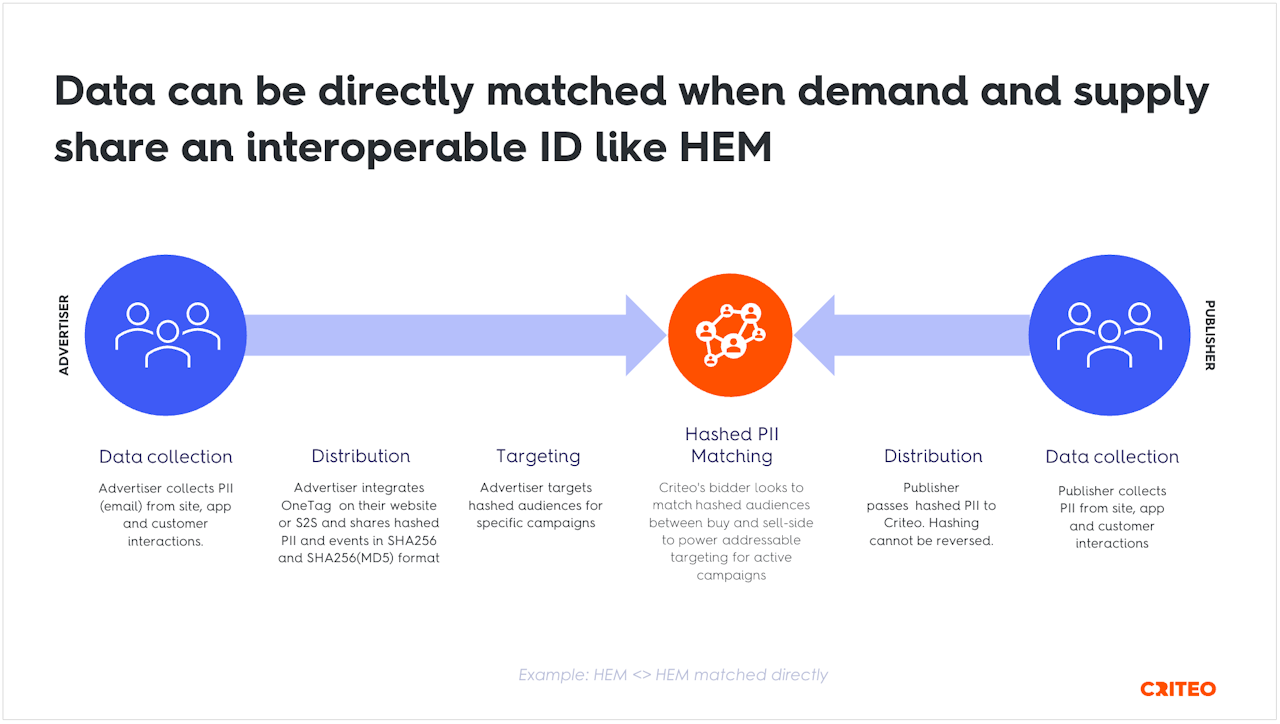 デマンドサイドとサプライサイドで HEM のように相互運用可能な ID を共有すると、データを直接照合できます。