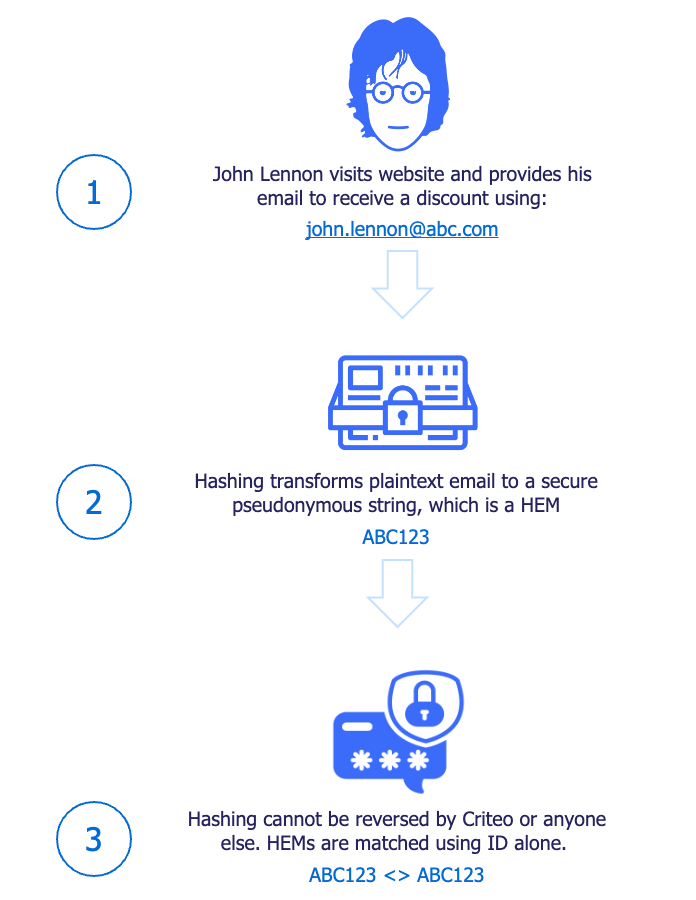 ハッシュ化されたメールアドレスは、ハッシュ化プロセスを通じて現実世界の ID を隠すことで、顧客のプライバシーを保護します。