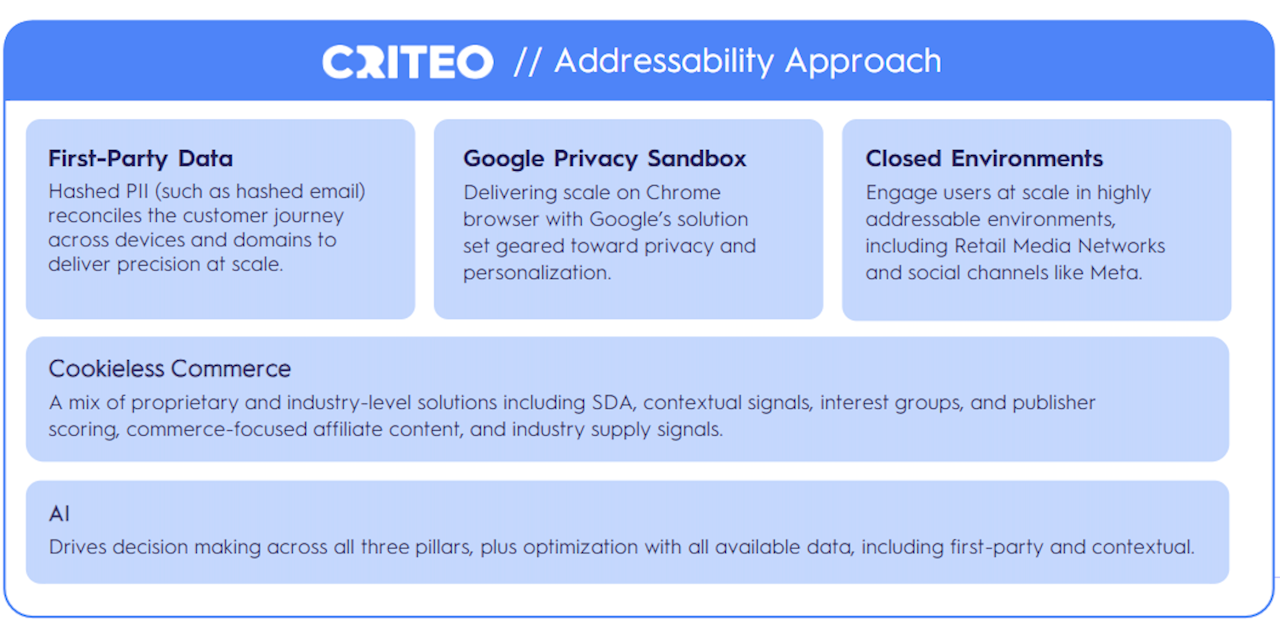Criteo には、広告呼び出しのインスタンスごとにアドレサビリティのサポートをリアルタイムに最適化する多角的な戦略があります。