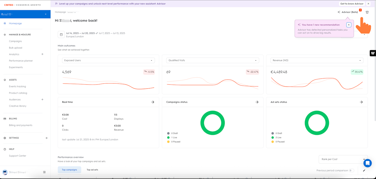 Criteo Advisor は、お持ちのアカウントとキャンペーンの情報に基づいてキャンペーンのパフォーマンスやセットアップを改善するため、パーソナライズされた推奨事項を提供する、Commerce Growth のセルフサービスツールです。